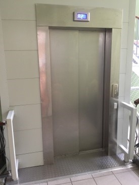 Справа от входной двери установлена система вызова сопровождающего для ЛОВЗ. Доступ в общежитие осуществляется с помощью мобильного гусеничного подъемника и лифта , с помощью сопровождающего лица.