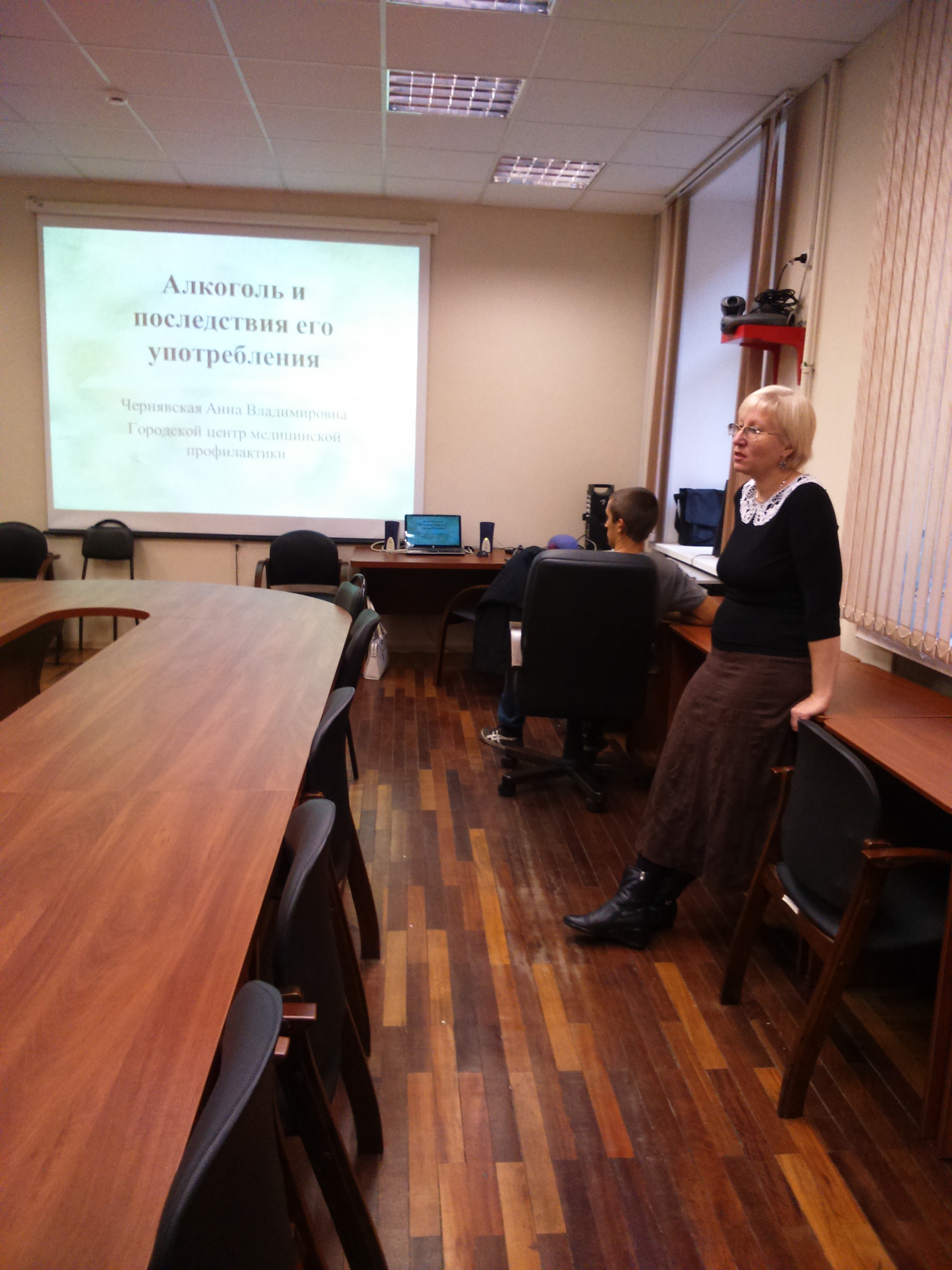 обучающий семинар для сотрудников колледжа по профилактике употребления алкогольных напитков среди молодёжи. Мероприятия было проведено в рамках программы совместной профилактической деятельности с СПб ГБУ «Центр медицинской профилактики». Семинар провела зав. организационно-методического отдела центра Чернявская Анна Владимировна.