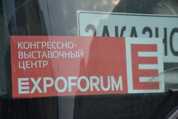 На приведенной ниже фотографии место указано стрелкой. Автобус от «Экспофорума» легко опознать по странному логотипу учреждения (надеемся, дизайнер взял не очень дорого):