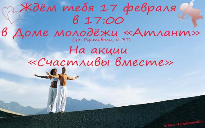 17 февраля в 17.00 в доме молодежи «Атлант», (ул. Руставели, д. 37) пройдет молодежная профилактическая акция «Счастливы вместе!», приуроченная ко Дню всех влюбленных.