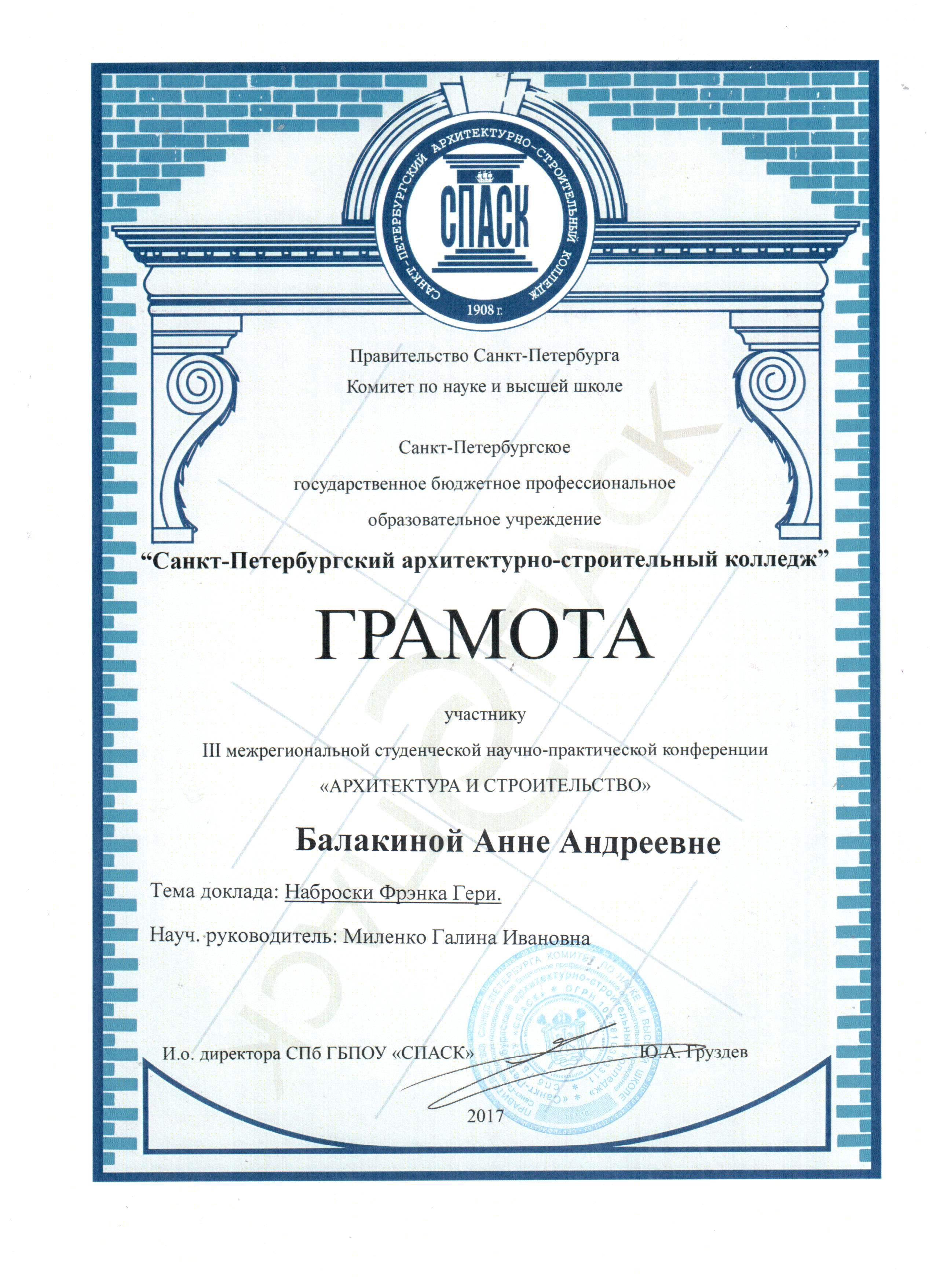 17 февраля 2017 года на базе СПб ГБПОУ «СПАСК» при поддержке Комитета по градостроительству и архитектуре прошла III межрегиональная студенческая научно-практическая конференция «АРХИТЕКТУРА И СТРОИТЕЛЬСТВО». Студенты групп 11А-11 и 9А-21 специальности «Архитектура» выступили с докладами по следующим секциям: «История архитектуры, архитектурное проектирование, дизайн ландшафта и интерьера», «Уникальные новые здания, сооружения и конструкции (российский и зарубежный опыт), вопросы экологии и энергоэффективности», «Инновации в строительных материалах и технологиях».