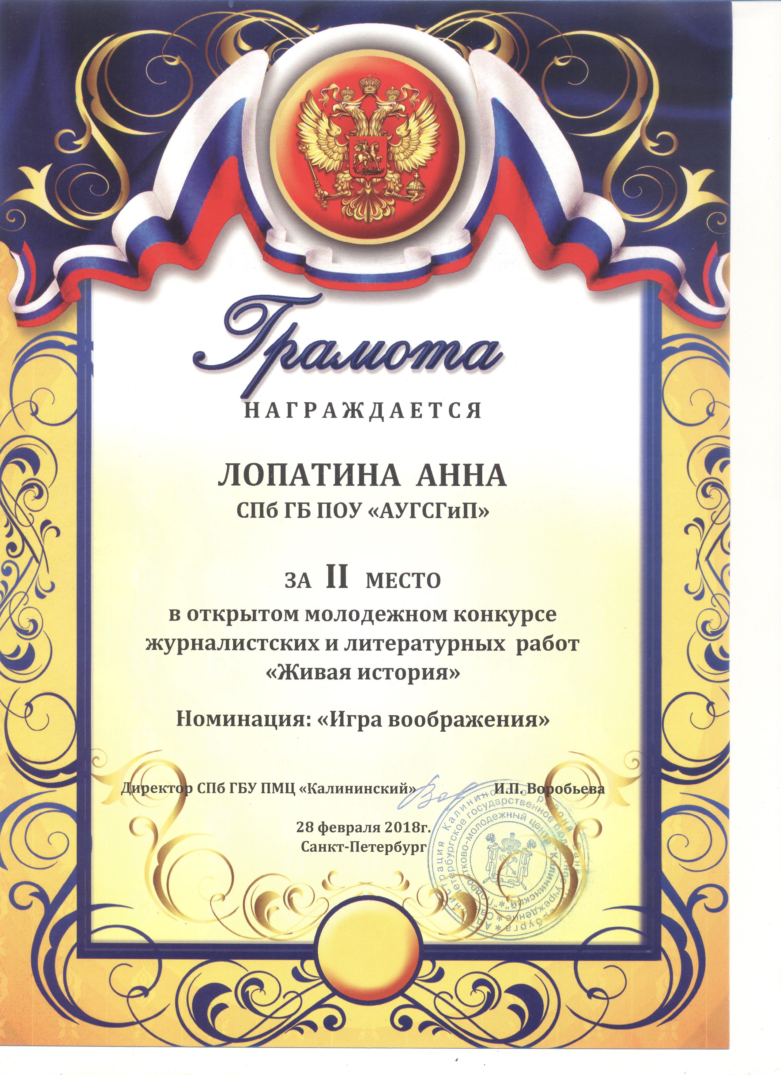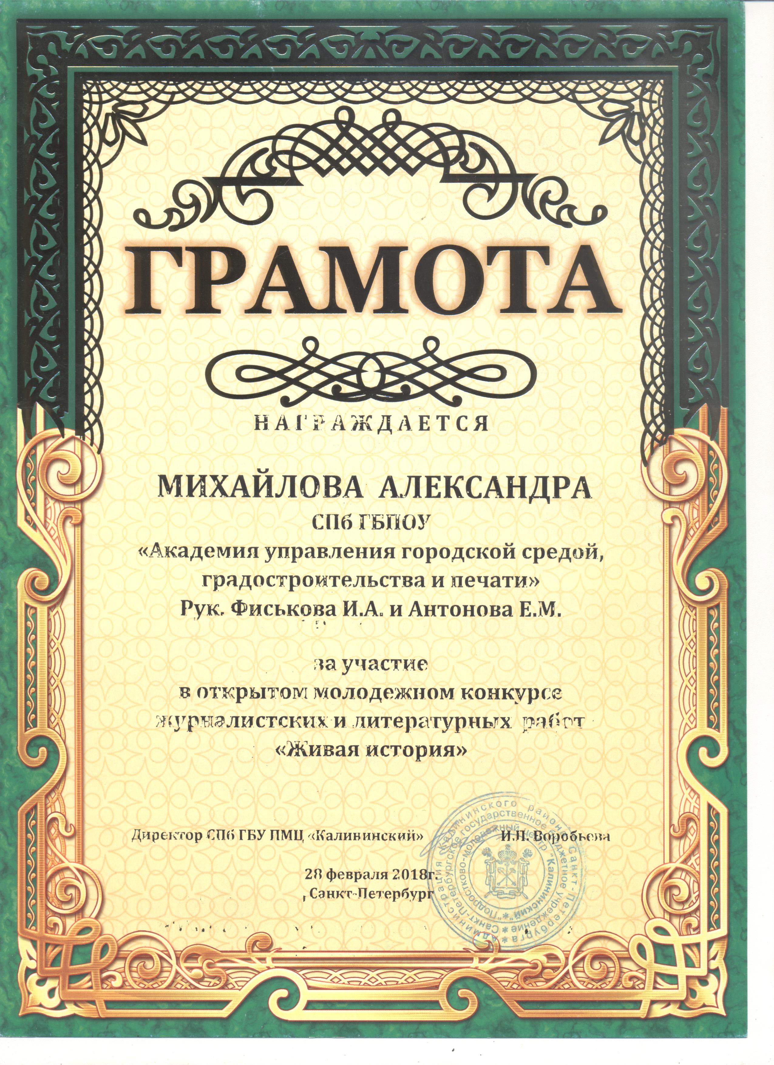 В феврале 2018г. студенты нашей Академии Лопатина Анна и Михайлова Александра приняли участие в открытом молодежном конкурсе журналистских и литературных работ «Живая история», по результатам, которого стали финалистами данного конкурса.