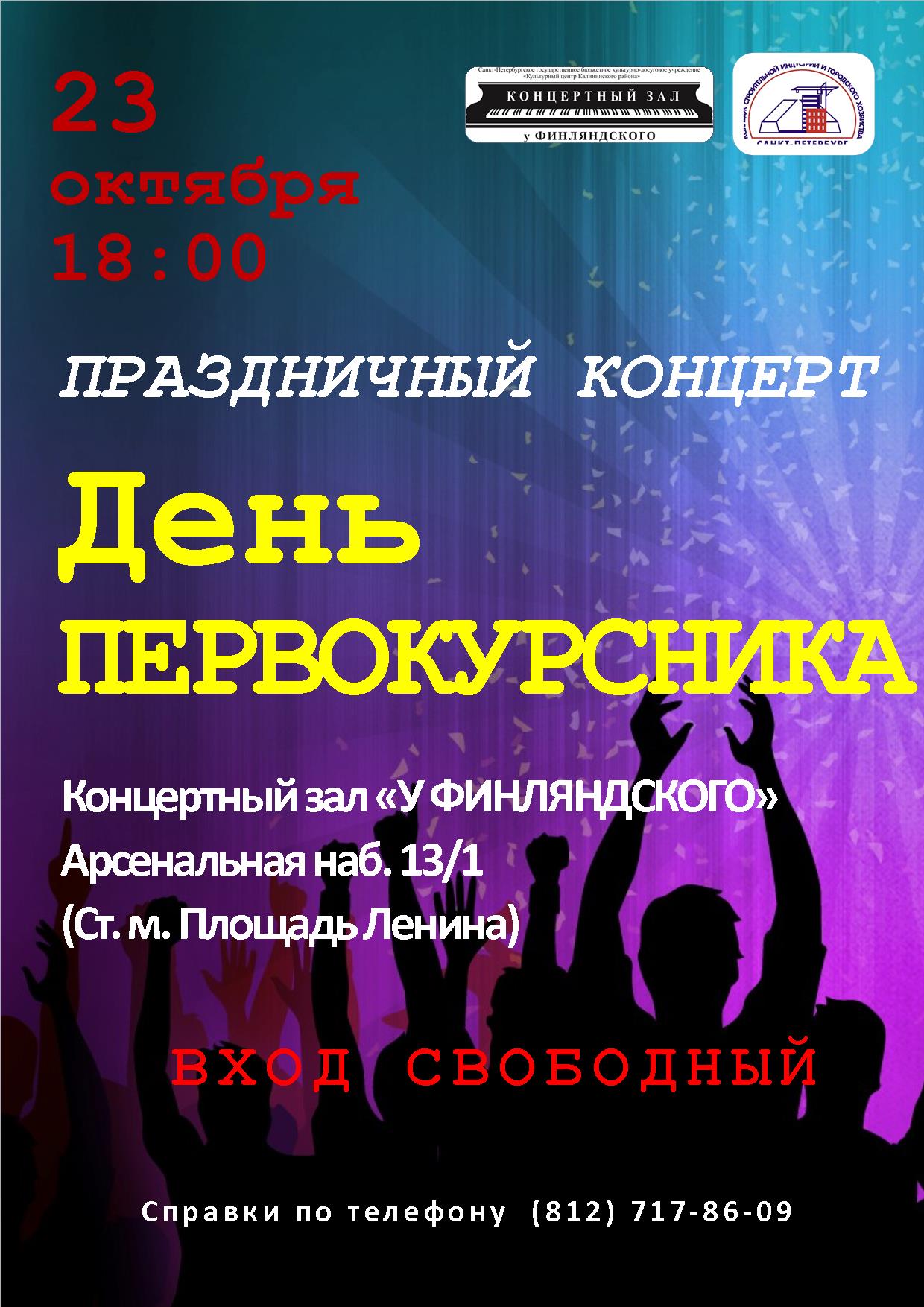 Приглашаем на праздничный концерт День Первокурсника 2014, который состоится 23 октября в 18:00 в концертном зале "У Финляндского", расположенного по адресу Арсенальная набережная, 13/1 (ст. м. Площадь Ленина)