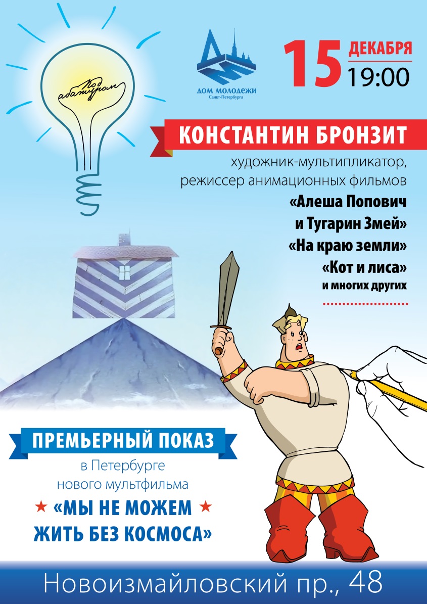 15 декабря 2014 года в Доме молодежи Санкт-Петербурга по адресу: Новоизмайловский пр., 48 состоялась встреча с художником-аниматором Константином Бронзитом и премьерный показ его мультфильма «Мы не можем жить без космоса». В мероприятии приняли участие студенты группы 9КС-11 под руководством педагога-воспитателя Феоктистовой А.Ю.