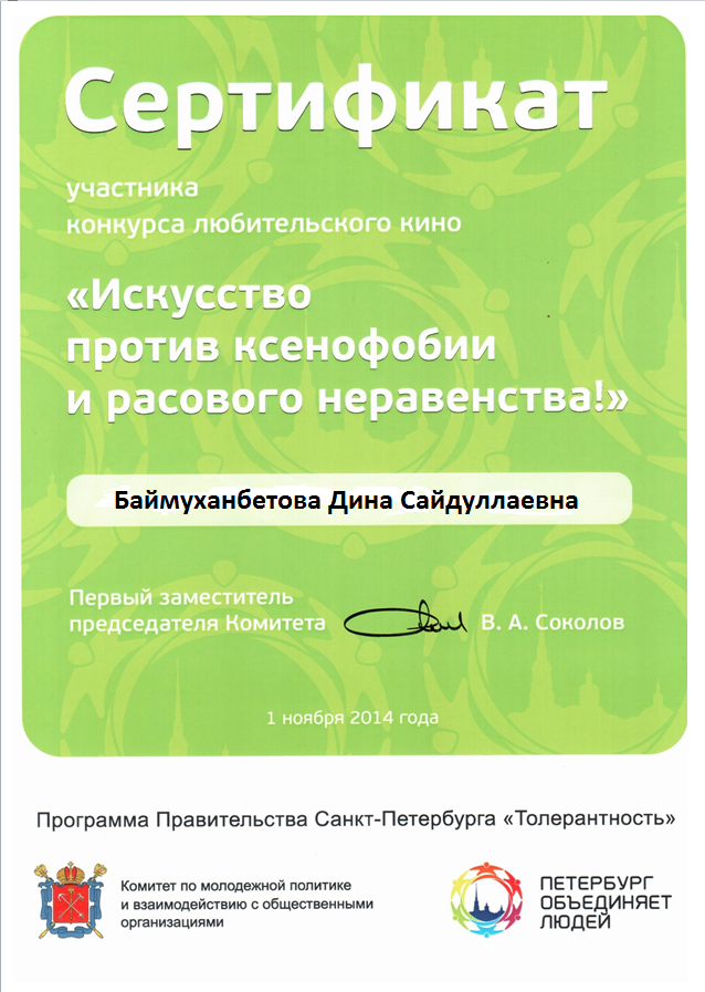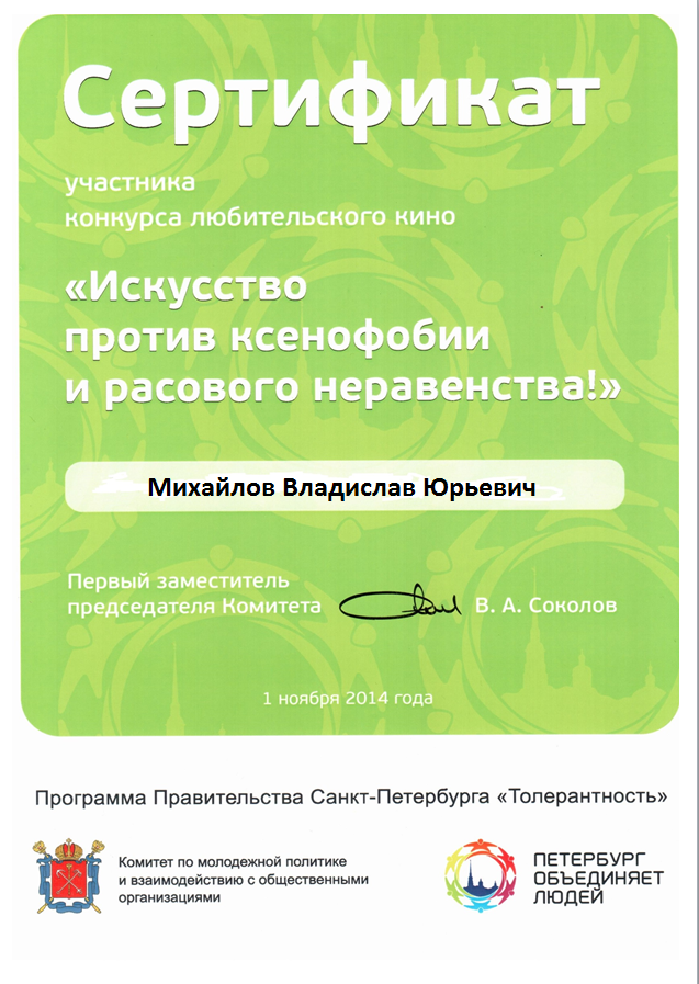 Комитетом по молодежной политике и взаимодействию с общественными организациями в рамках Программы гармонизации межкультурных, межэтнических и межконфессиональных отношений, воспитания культуры толерантности в Санкт-Петербурге на 2011-2015 годы (программа "Толерантность") с 1 июня 2014 года проводился Конкурс любительского кино для молодежи, основной задачей которого является создание фильмов на темы противодействия расизму, ксенофобии и положению мигрантов в обществе «Искусство против ксенофобии и расового неравенства!»