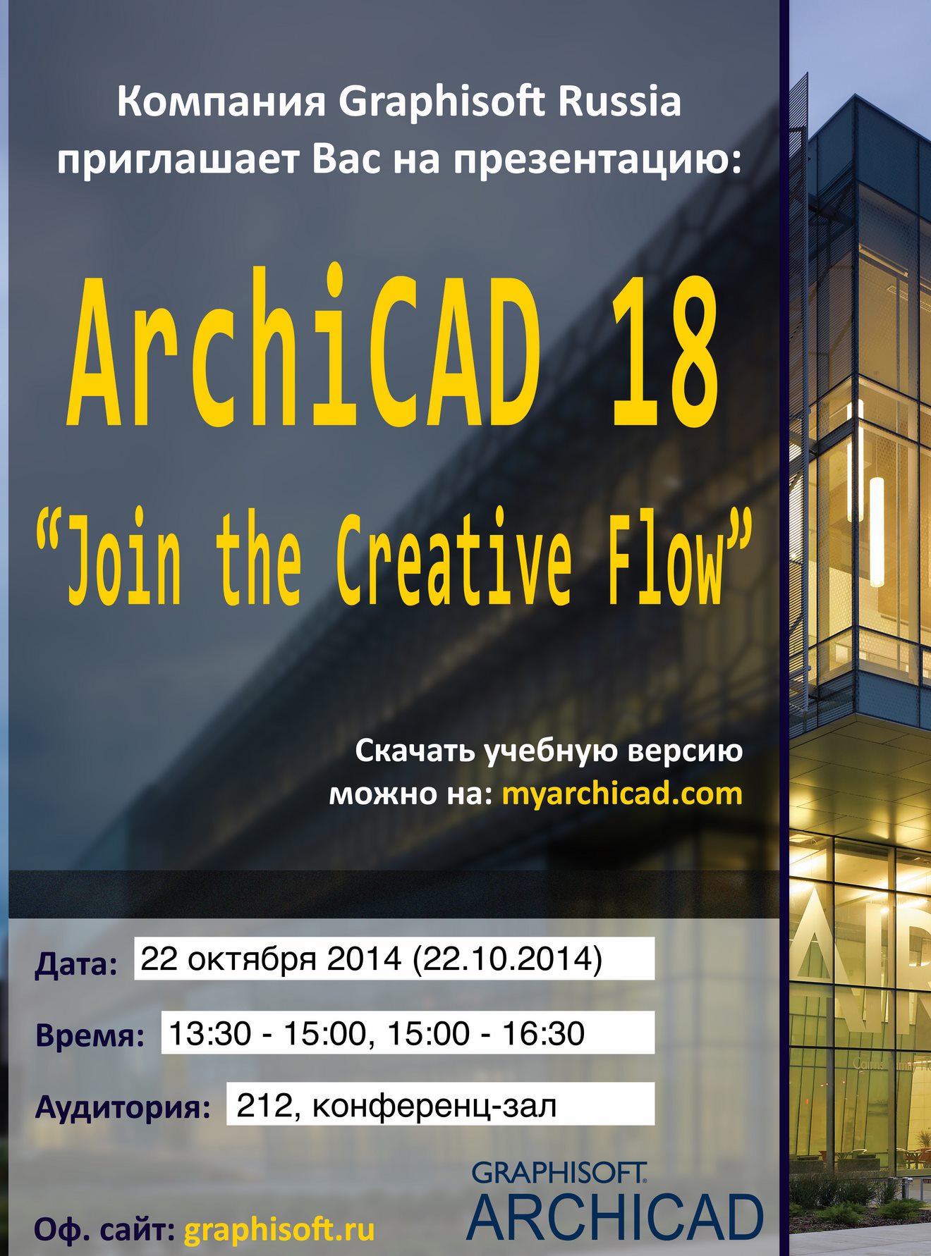 22.10.2014 будет представлена новая версия программы ArchiCAD 18, а также проведен небольшой мастер-класс для преподавателей и студентов нашего колледжа.