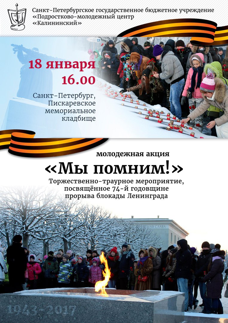 18 января 2017г., исполняется 74 года со дня прорыва блокады Ленинграда. В Петербурге и области пройдут памятные мероприятия. Приглашаем всех студентов принять участие в молодежной патриотической акция "Мы помним!" на Пискаревском мемориальном кладбище.