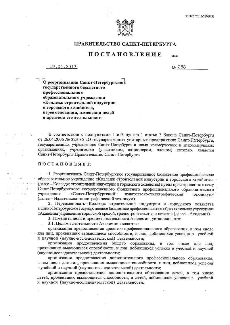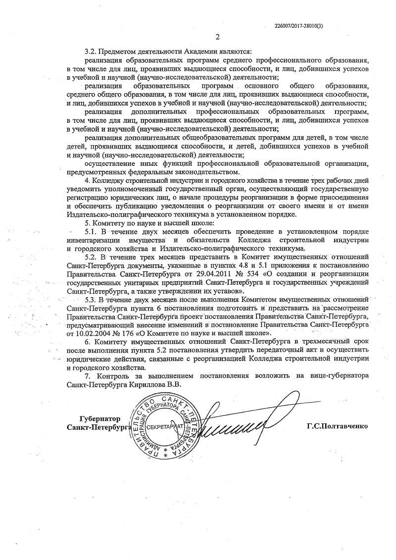 Постановление Правительства Санкт-Петербурга о реорганизации Колледжа