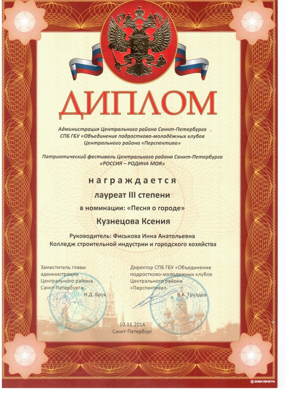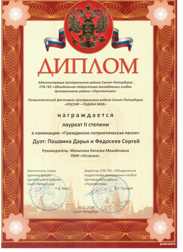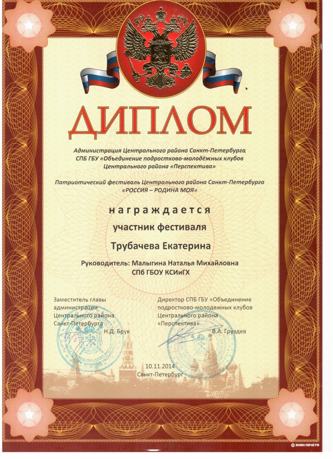 Отдел молодежной политики, физической культуры и спорта администрации Центрального района Санкт-Петербурга и Санкт-Петербургское государственное бюджетное учреждение “Объединение подростково-молодежных клубов Центрального района “Перспектива” с 27 октября по 3 ноября 2014 года провели патриотический фестиваль «Россия – Родина моя!».