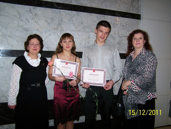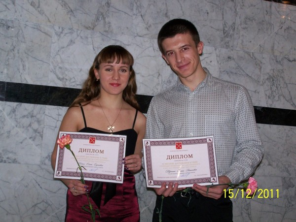 15 декабря 2011 года на XVI Ассамблее состоялось торжественное вручение Дипломов Правительства Санкт-Петербурга молодым ученым, специалистам и студентам высших и средних учебных заведений за отличную учебу и выдающиеся достижения. На вручении присутствовали студенты Колледжа строительной индустрии и городского хозяйства Копыл Олеся (гр. С-47) и Турыгин Роман (С-41), которые также являются спендиатами Губернаторской премии. От всей души поздравляем наших студентов и желаем им дальнейших успехов!