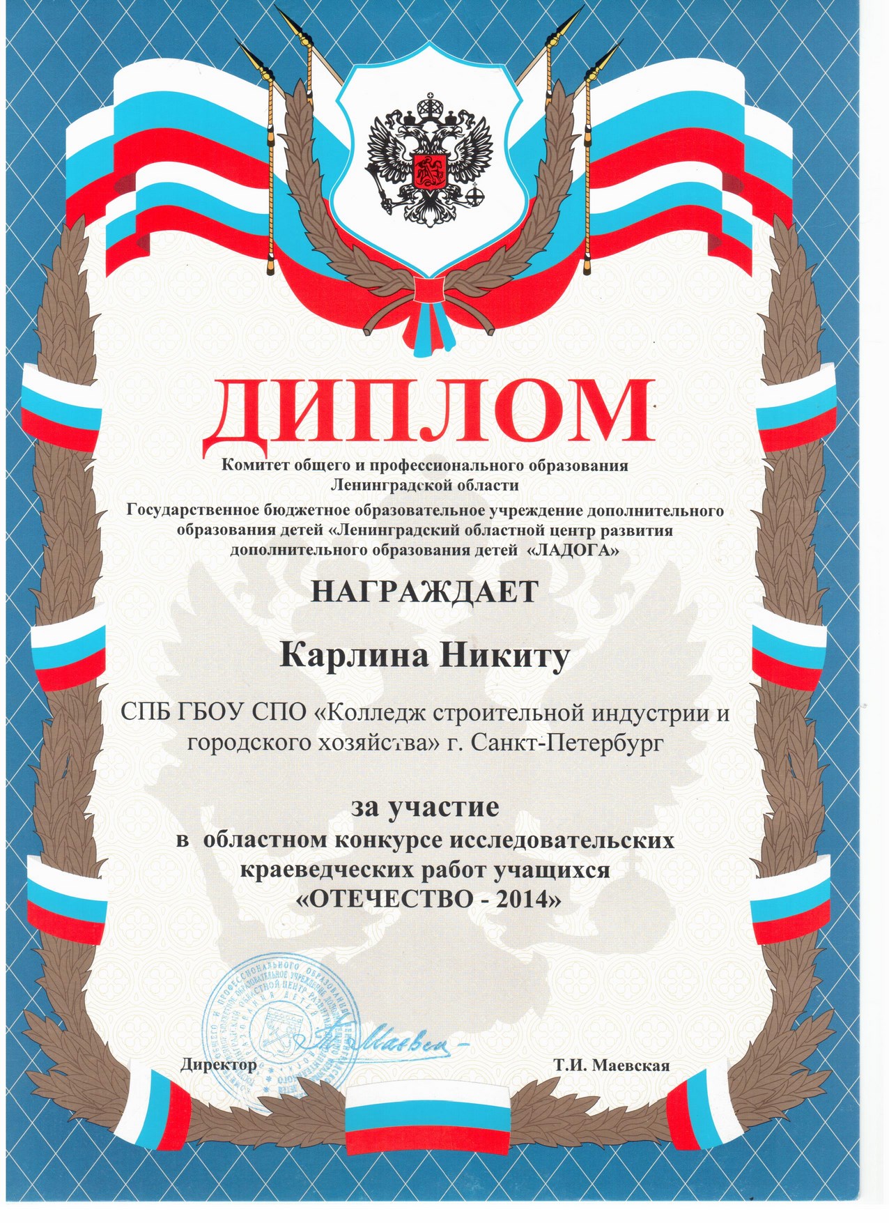 17.12.2014 г. студент нашего колледжа группы 9С-12 Карлин Никита стал победителем областного этапа Всероссийского конкурса исследовательски