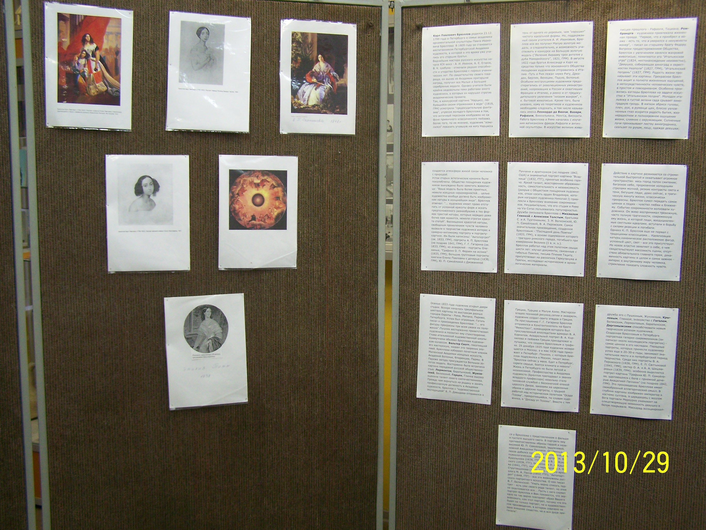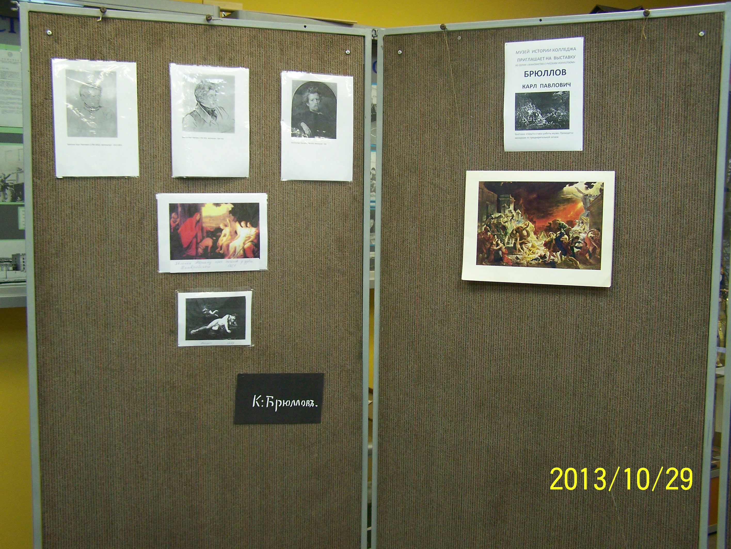 Музей истории колледжа строительной индустрии и городского хозяйства на Руставели занимается сбором, хранением, демонстрации материала, относящегося к истории колледжа, района, города. Но для знакомства студентов с разными сторонами культурной жизни нашей страны, музей систематически проводит тематические выставки, рассказывающие о великих художниках, о знаменитых людях. Так в музее были организованы выставки, посвященные творчеству Шишкина, Сурикова, в настоящее время проходит выставка, посвященная творчеству Карла Павловича Брюллова. Великий русский художник, профессор исторического жанра живописи, создатель картины «Последний день Помпеи» и бесчисленного количества замечательных портретов современников – он должен быть известен нашим студентам. Родившийся в один год с Александром Сергеевичем Пушкиным, он первый бросил вызов господствующему в то время классицизму – направлению искусства подражающему итальянскому античному, который все представлял в «идеальном» изображении, не давая художникам заниматься свободной композицией. Брюллов впервые стал изображать «живые» лица и не обязательно обращенные в сторону зрителя. Не отказываясь от красоты классицизма, он вдохнул свежую струю в создаваемее полотна. Нелегкая жизнь России в период после восстания декабристов 1825 года, несбывшиеся мечты об отмене крепостного права, нуждалась в таком художнике, как «Великий Карл»- так называли Брюллова современники. Он прожил недолгую, но великую жизнь, оставив после себя незабываемы творения, которые хранятся в главных музеях России и всего мира.