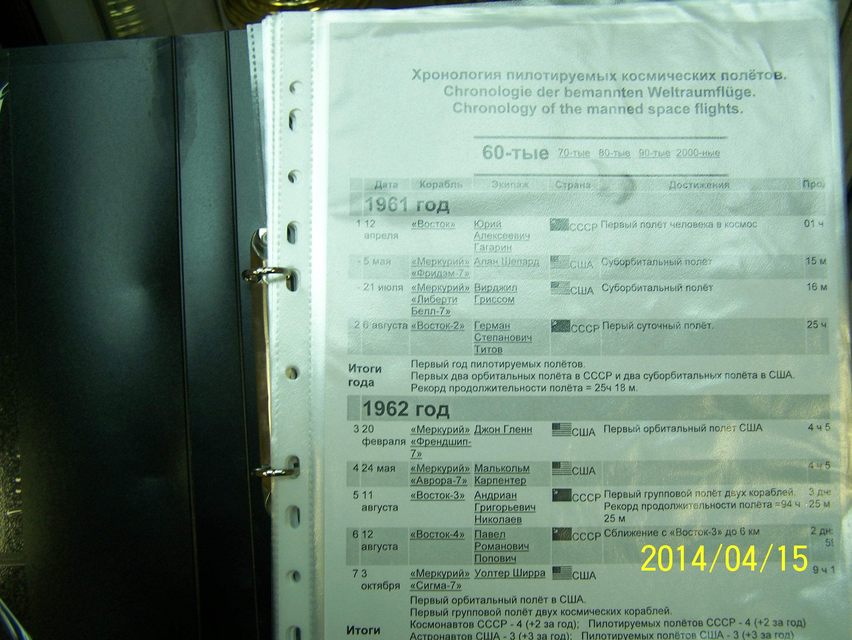 Изобретение пороха, открытия различных наук, работы ученых - сделали возможным конструирование и полет человека в космос. Представлены подлинные материалы о первом полете, о выходе человека в открытый космос, показана таблица всех пилотируемы космических кораблей мира до 2013 года. Есть материалы о неудачных полётах, когда космонавты не возвращались на Землю живыми.