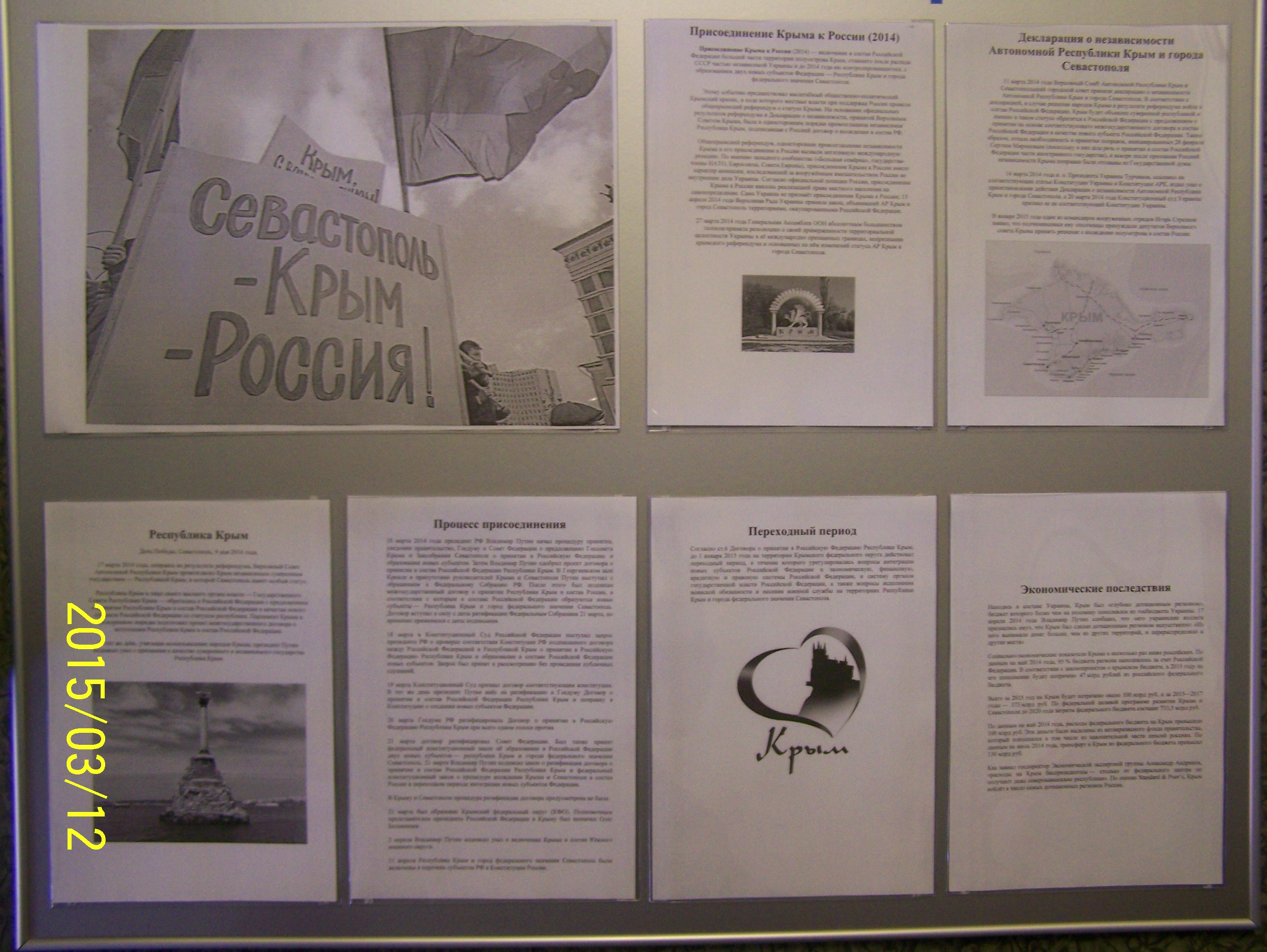 В честь годовщины этого события в библиотеке колледжа оформлен информационный стенд «Севастополь – Крым – Россия». На сайте колледжа в разделе Библиотека оформлена виртуальная выставка «Крым и Севастополь: их историческое значение для России».